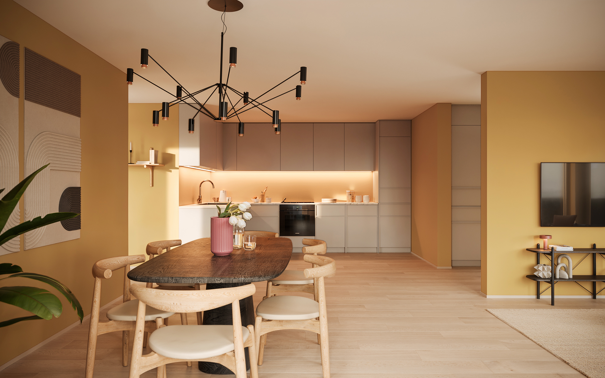 - Kjøkken med tidløst design og integrerte hvitevarer