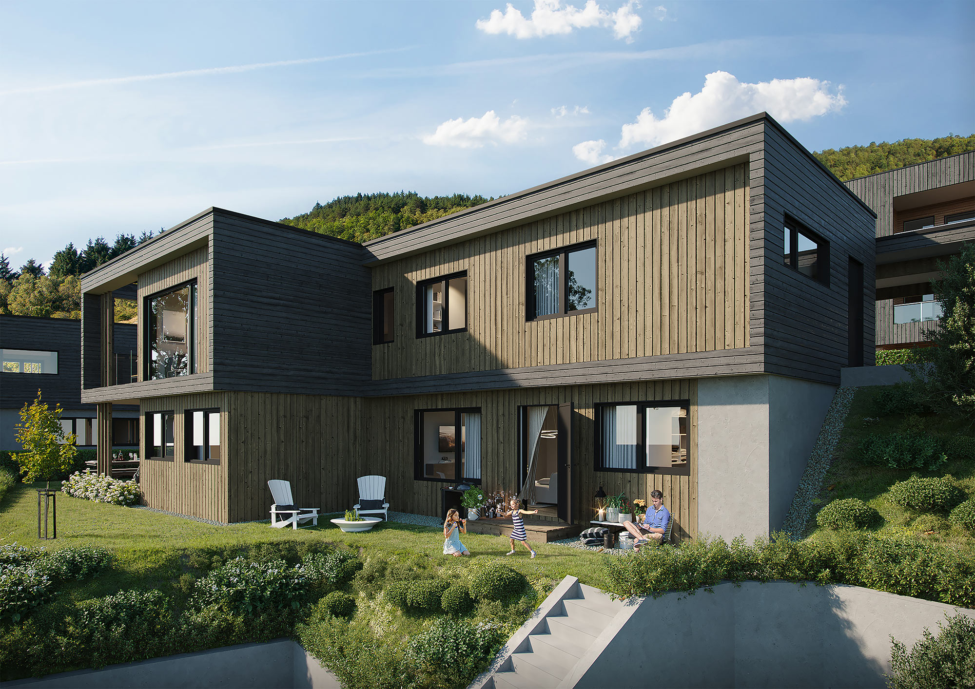 Dette er en bolig som leveres nøkkelferdig, inkl. carport med bod, asfaltert gårdsrom og sådd plen. Støpt trapp i betong ned til hage. Boligen får royalimpregnert kledning, ferdig malt tilpasset området.